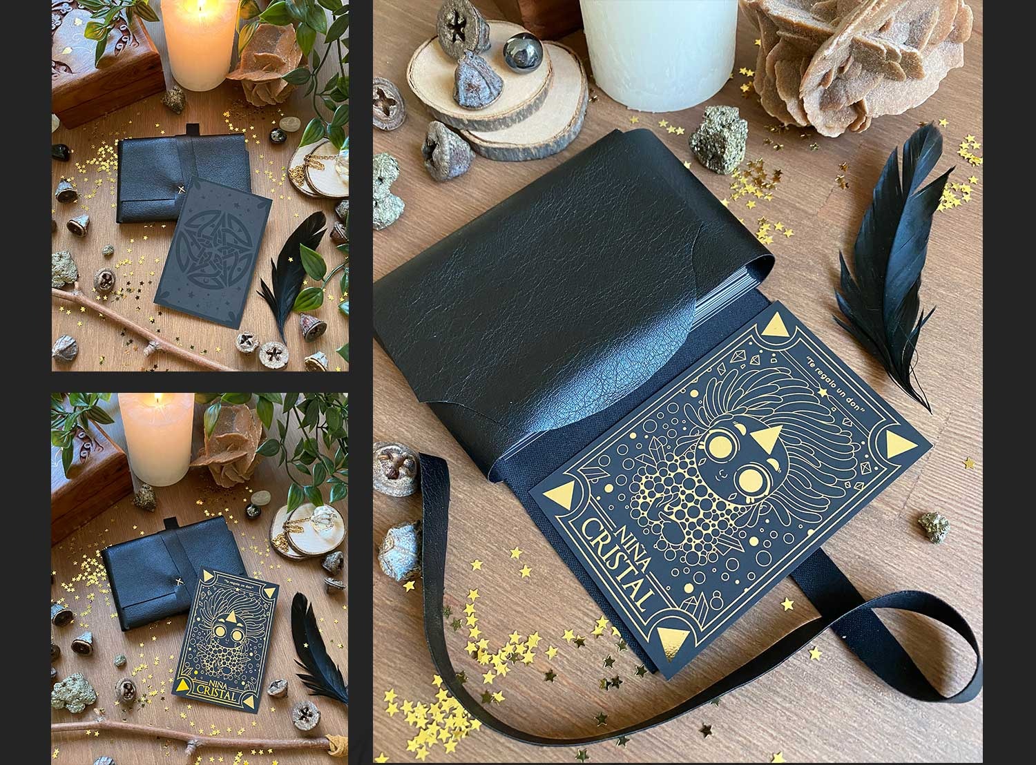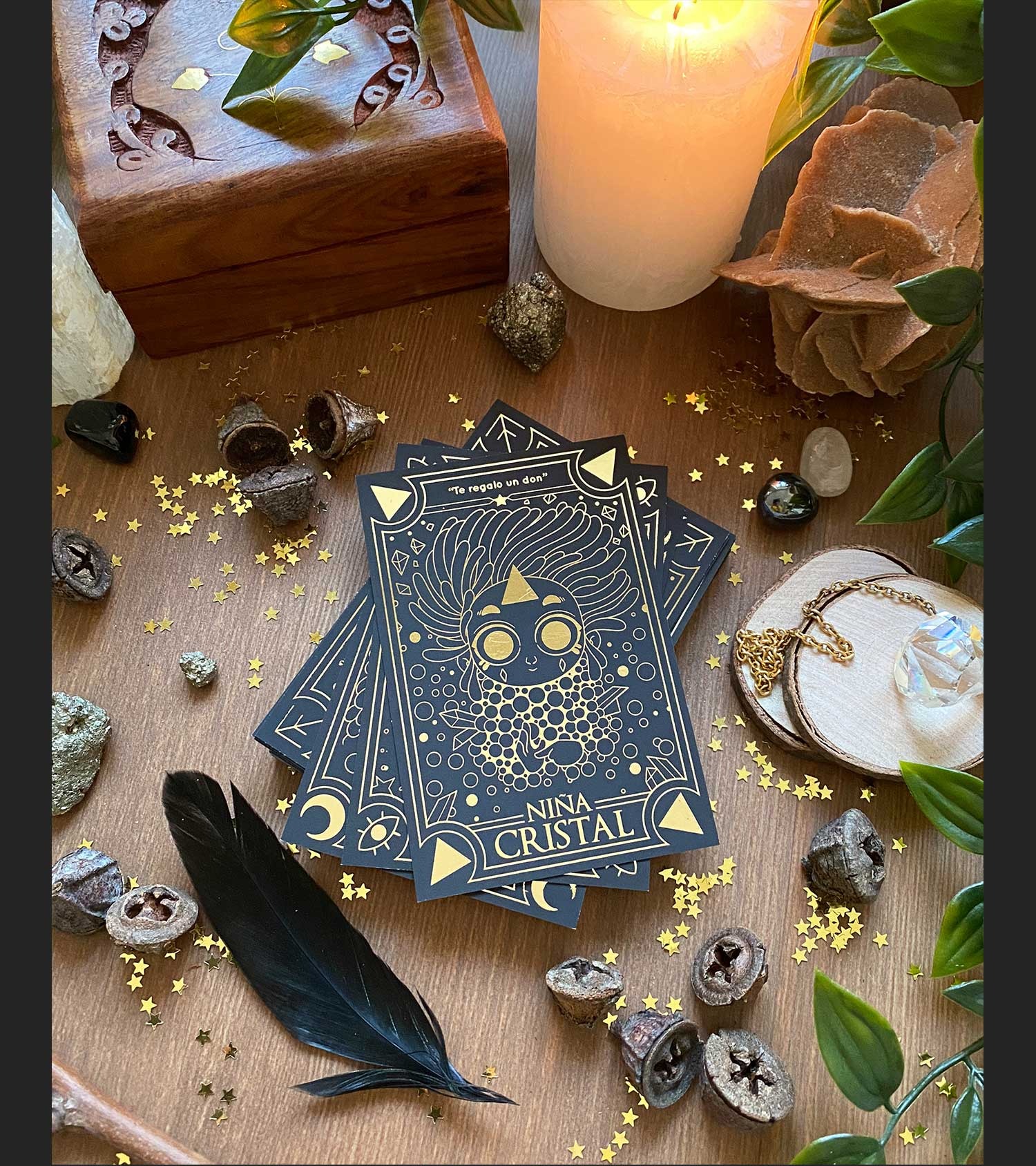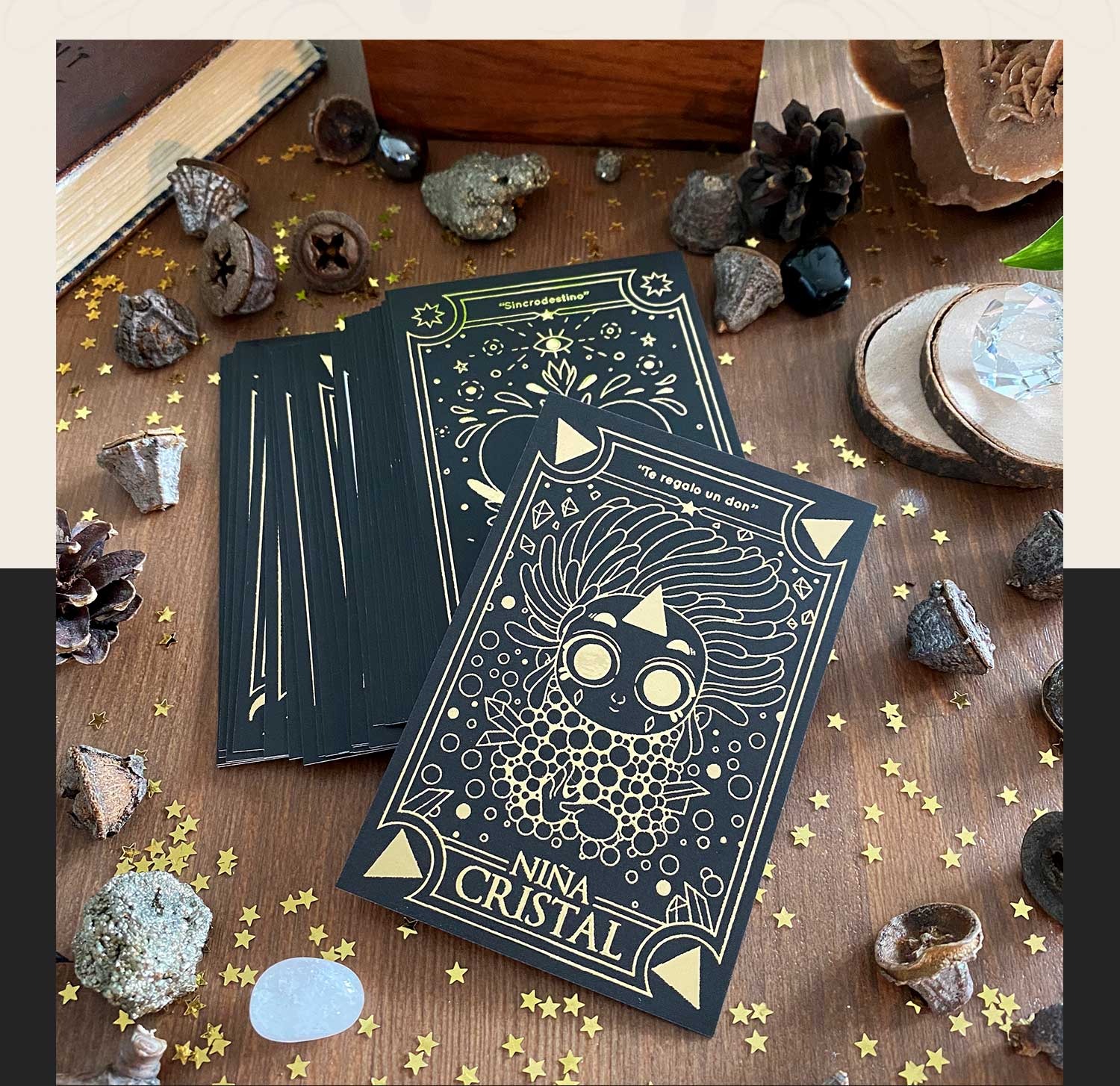 Deck composed of thirty-three illustrated cards and printed on gold and silver of 105 mm x 70 mm. The deck contains a QR code, which allows access to a full Guide about the mechanic of the game and its symbolism. (Printed by AGRP).
