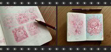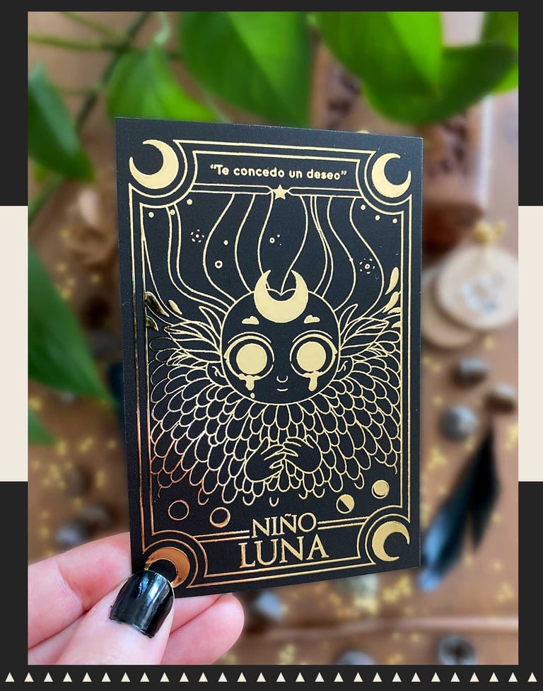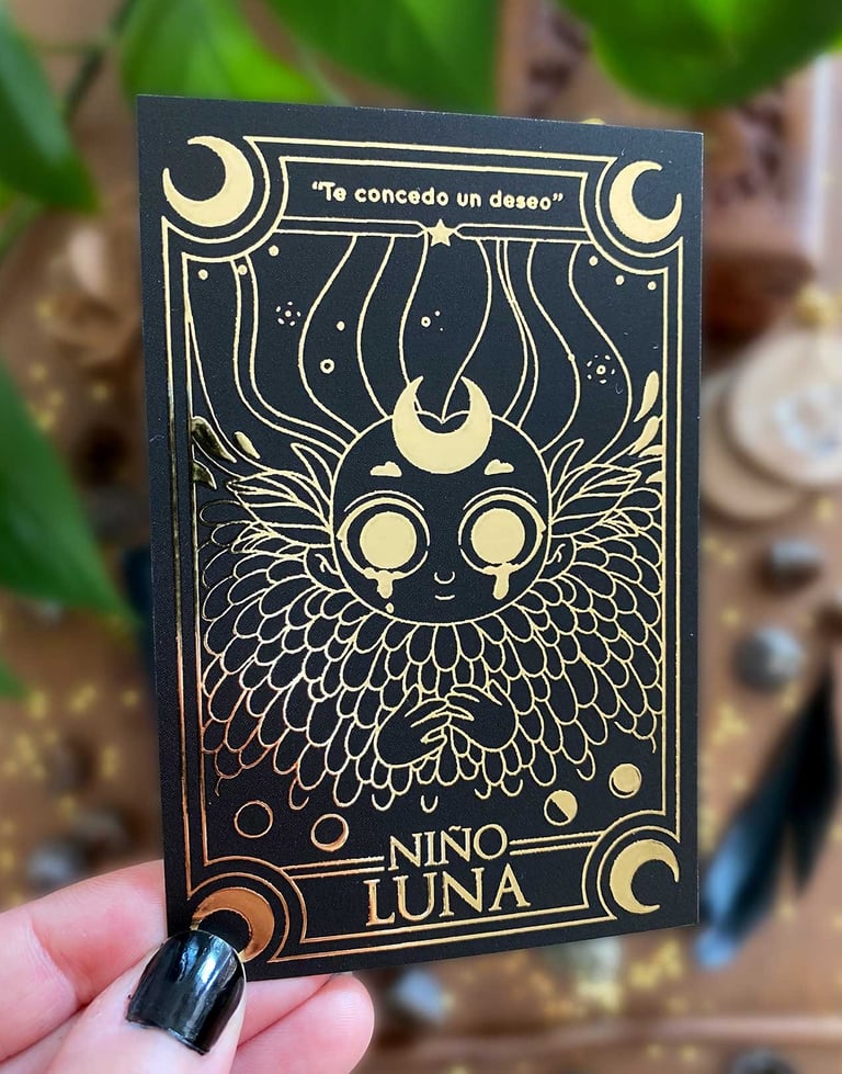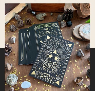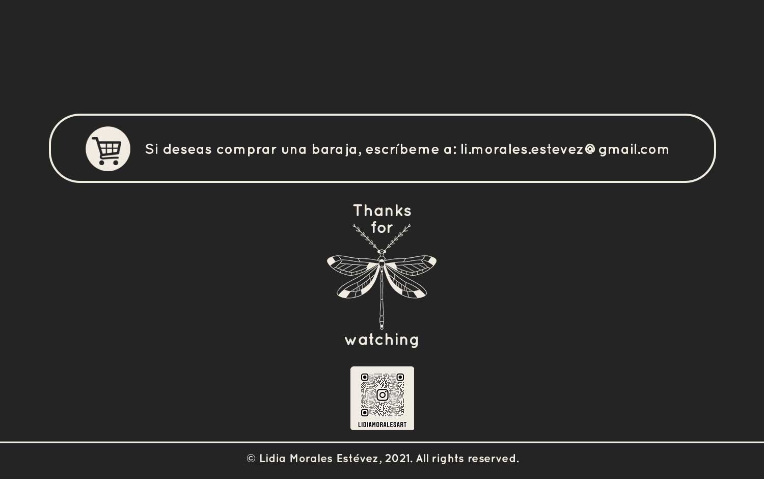 Deck composed of thirty-three illustrated cards and printed on gold and silver of 105 mm x 70 mm. The deck contains a QR code, which allows access to a full Guide about the mechanic of the game and its symbolism. (Printed by AGRP).