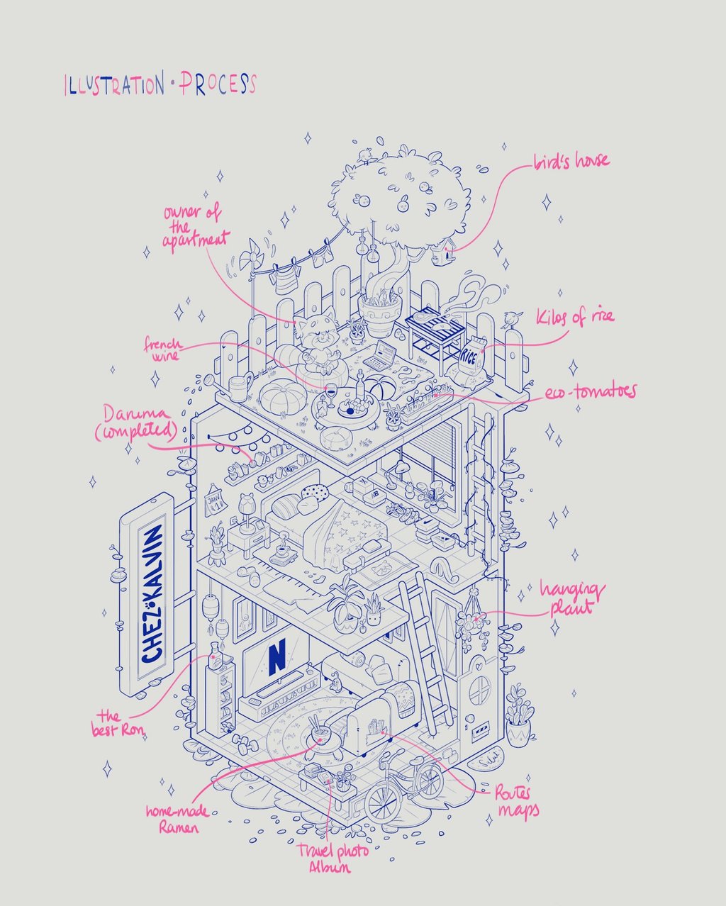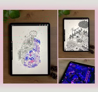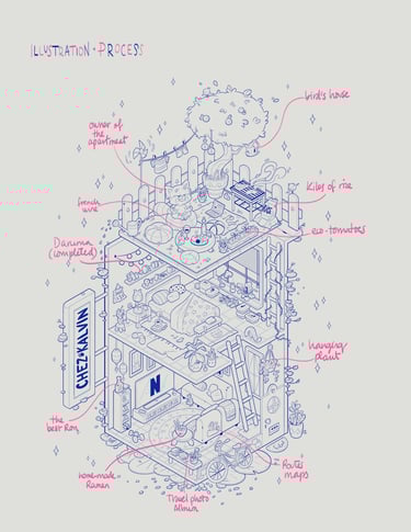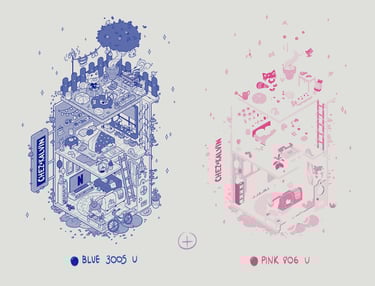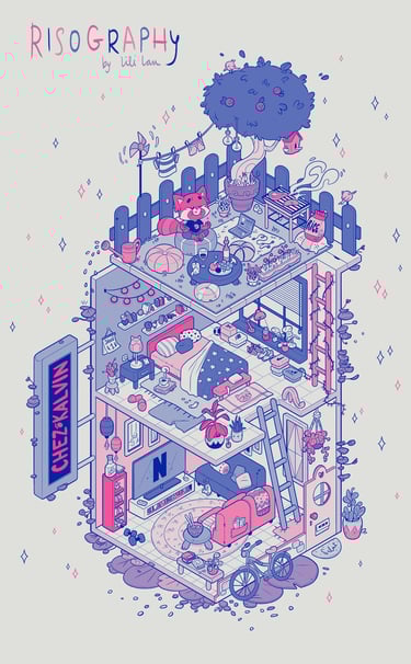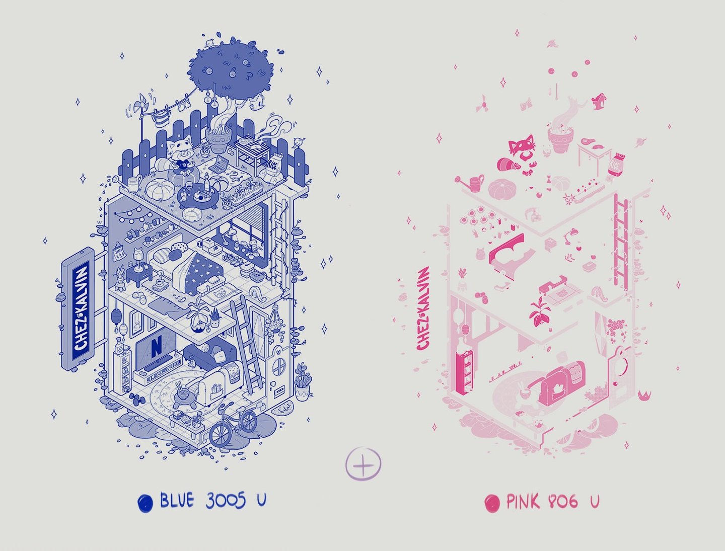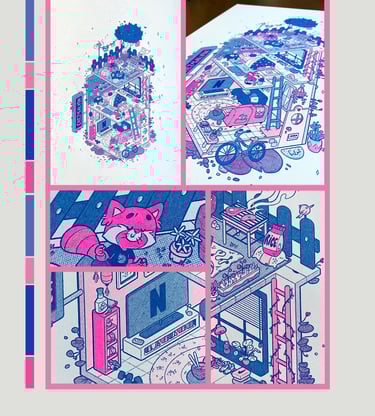 Digital illustration for bicolor Risography & making off. Printed by Tuukka Kaila at Roof Top Press.